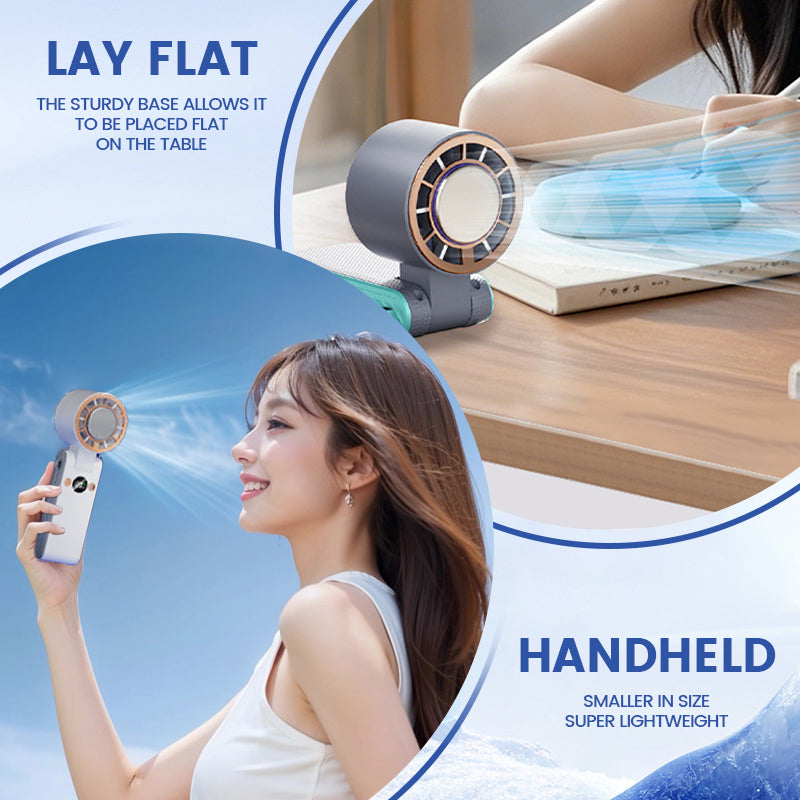 ERGONOMIC FOLDABLE DESIGN – The compact, rounded body offers multi-angle adjustment and can be folded into a desktop fan for hands-free use. Its lightweight, portable design easily fits into a backpack, while the textured, non-slip handle ensures a secure grip during use.